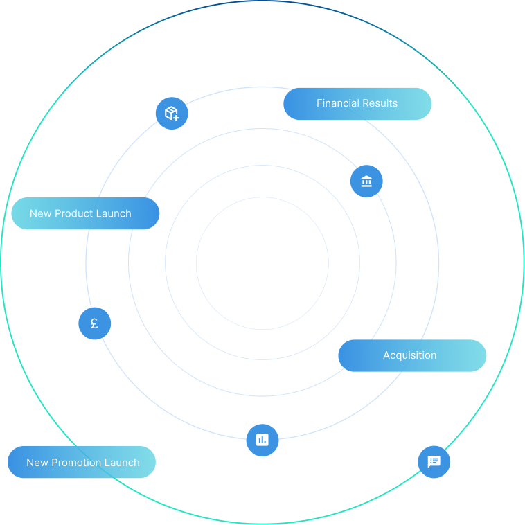 Each companies activity such as product launches, partnerships, promotions, events, financial results, etc is stored in your Knowledge Base.